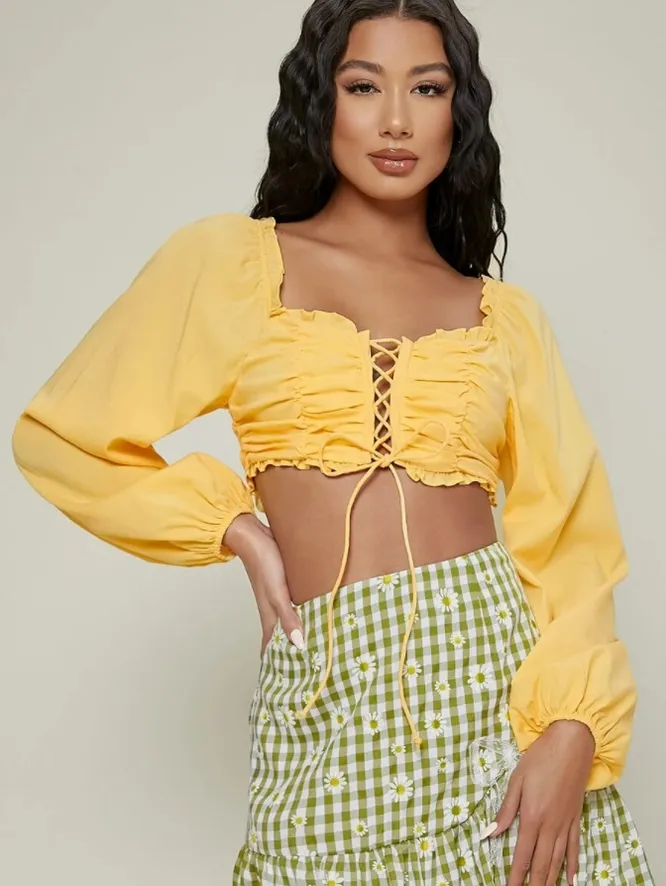 Для создания эффектного летнего образа выбирай желтый укороченный кроп-топ с объемными рукавами. Носи его с широкими белыми брюками или шортами с высокой посадкой.