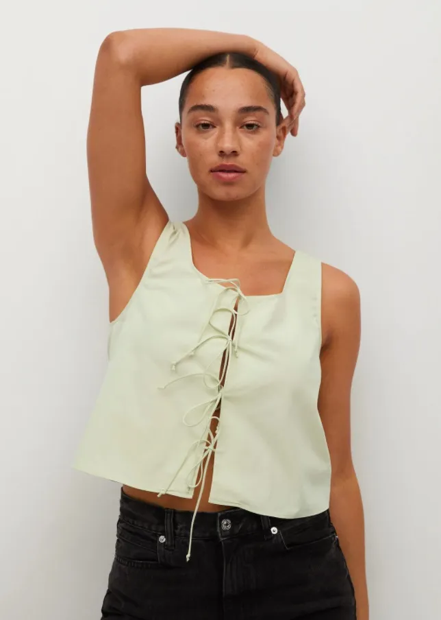 Топ в спортивном стиле с пикантной шнуровкой спереди стильно смотрится с джинсовой мини-юбкой, велосипедками и свободными рубашками.