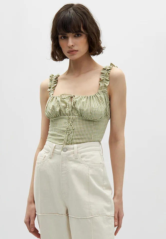 Поклонницам романтичного стиля стоит обратить внимание на клетчатый топ в корсетном стиле со шнуровкой и оборками. Лучшей партией к нему станет мили-юбка с разрезом, удлиненные шорты или мини-юбка со сборками.
