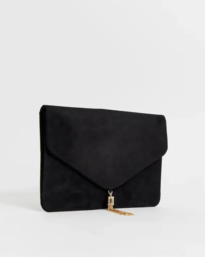 К вечернему наряду идеально подойдет бархатистый клатч-конверт с золотистой кисточкой.