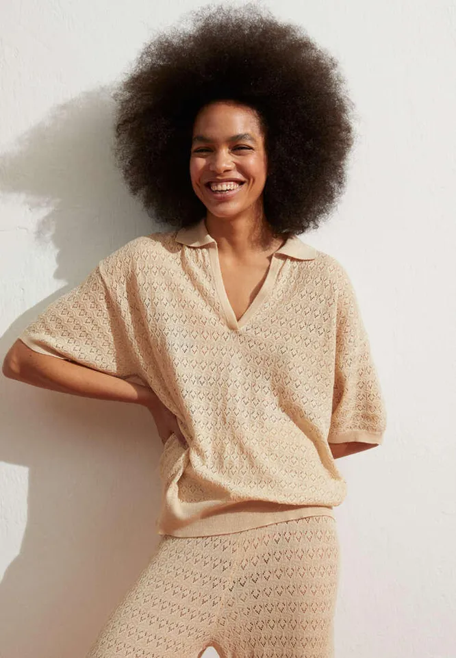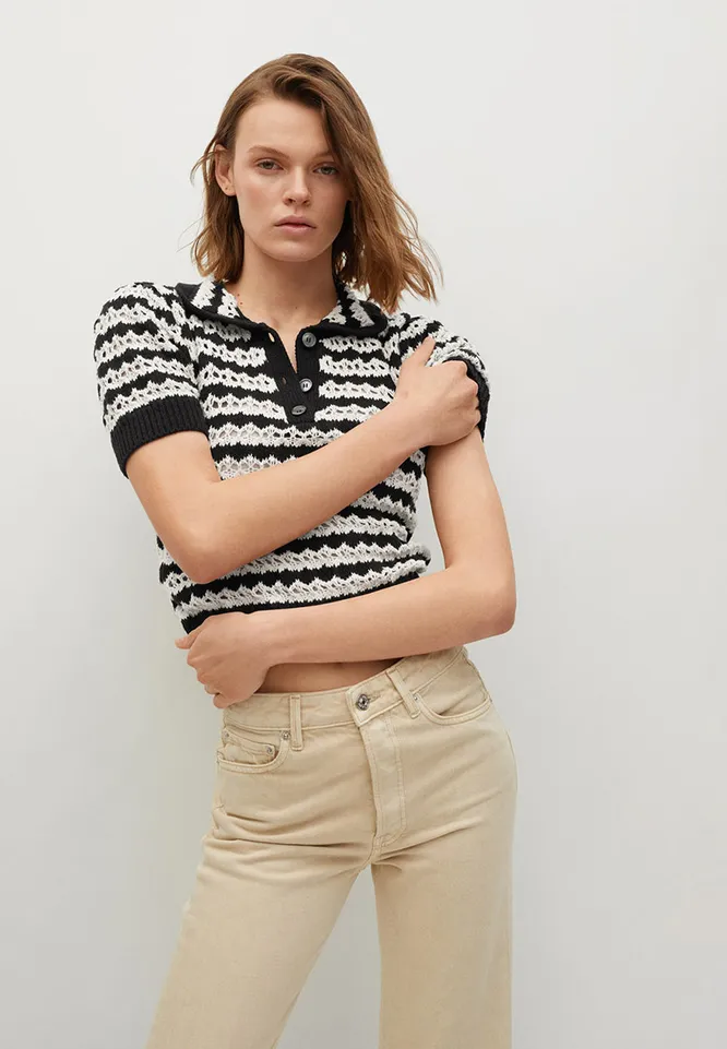 Ключевой тренд сезона — вещи в технике кроше. Обрати внимание на вязаное поло в черно-белую полоску. В нем можно отправиться и в офис, и на прогулку по городу.