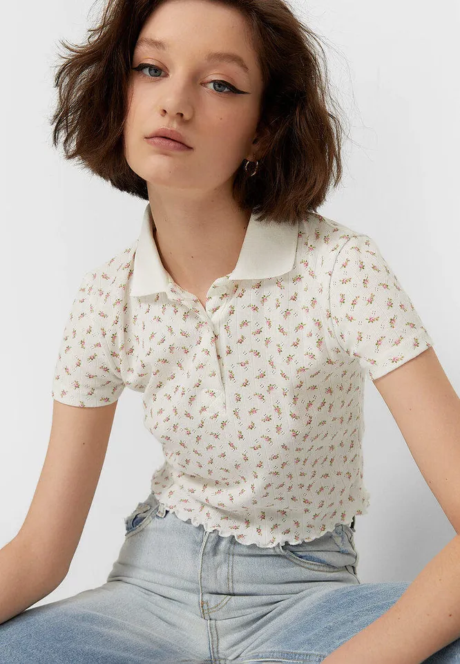 Интересно и мило смотрится поло с принтом в винтажном стиле. Лучше всего оно сочетается со светлыми джинсами или короткой юбкой.