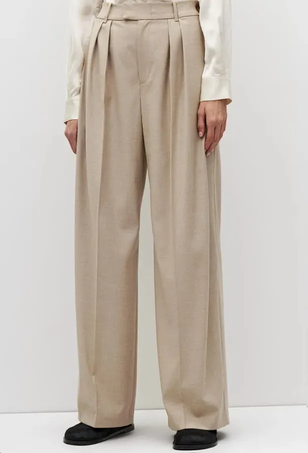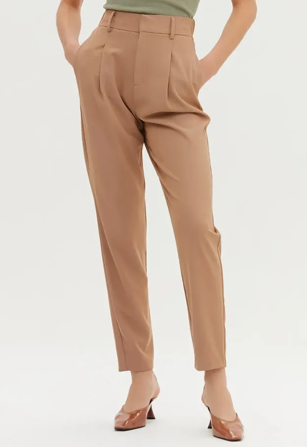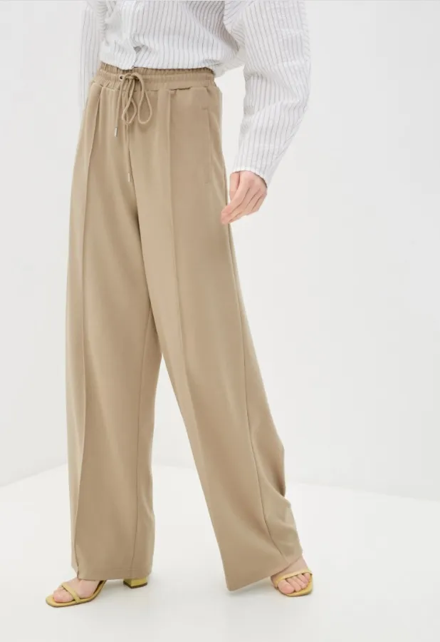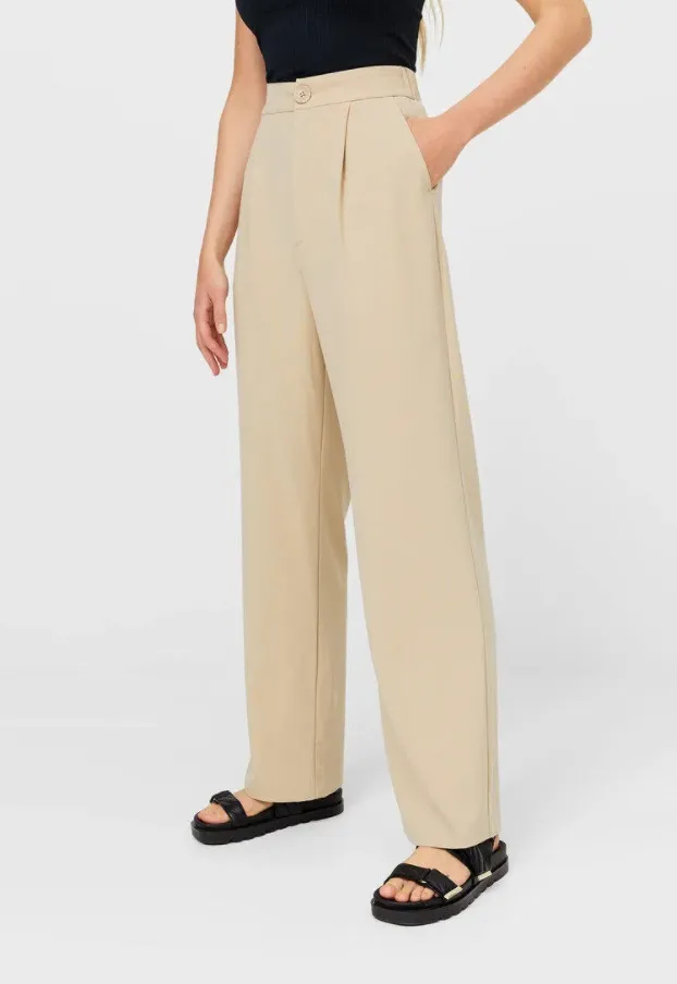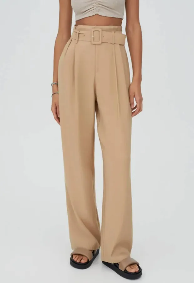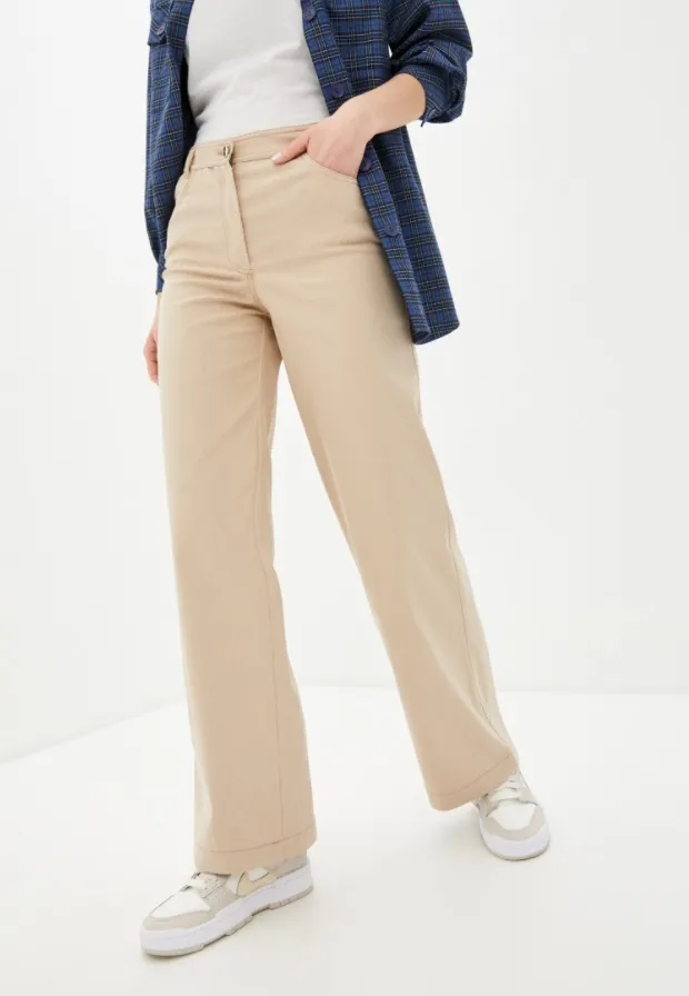 Вечная классика — бежевые брюки с высокой посадкой, защипами и стрелками. Они одинаково хорошо сочетаются как с туфлями, так и с кроссовками и кедами.
