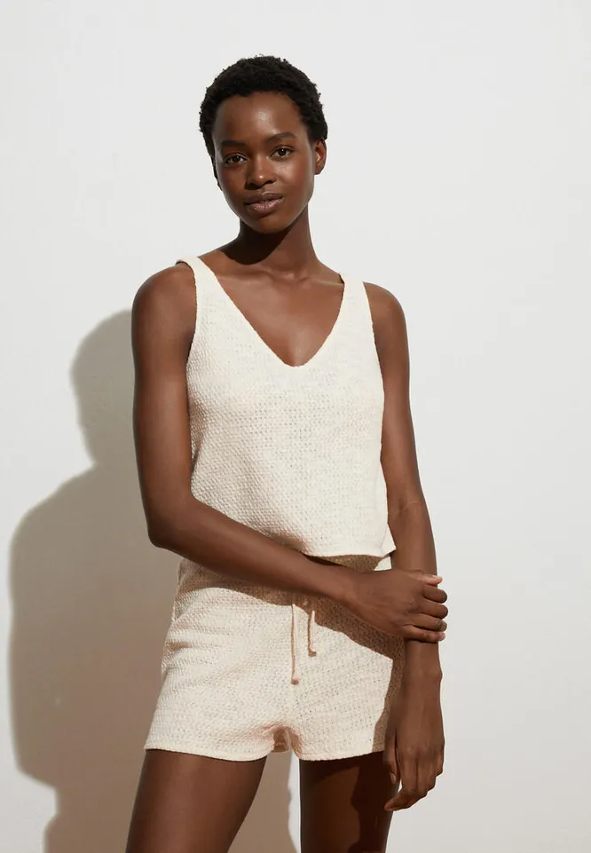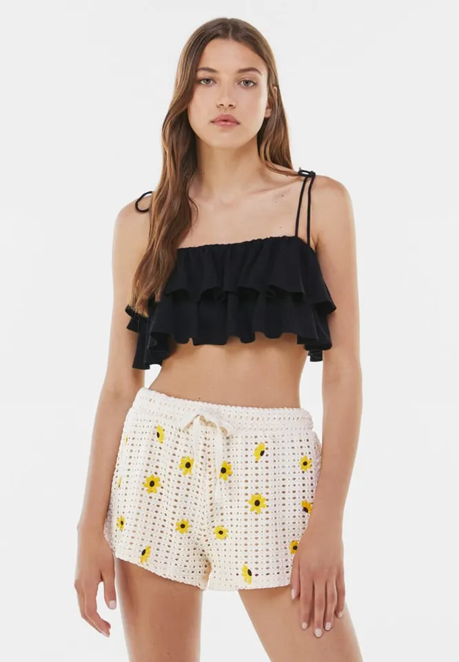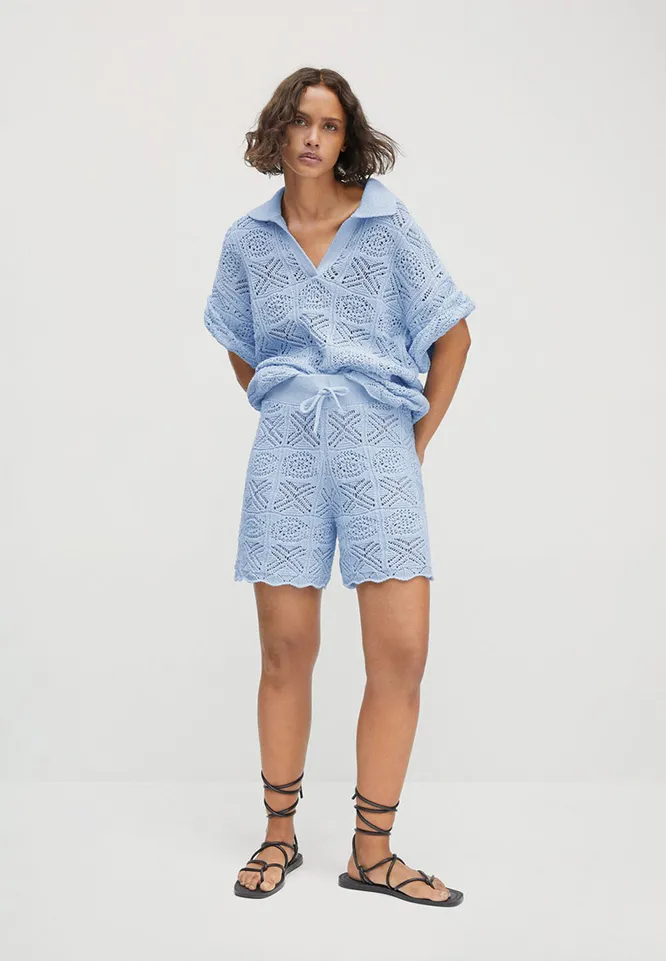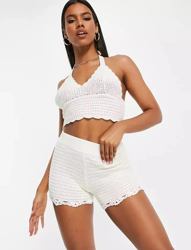 Не забывай и про милые шорты, выполненные в технике кроше. К ним подойдут романтичные топы с квадратным вырезом и рукавами-фонариками, струящиеся блузки в стиле бохо, трикотажные топы в рубчик.
