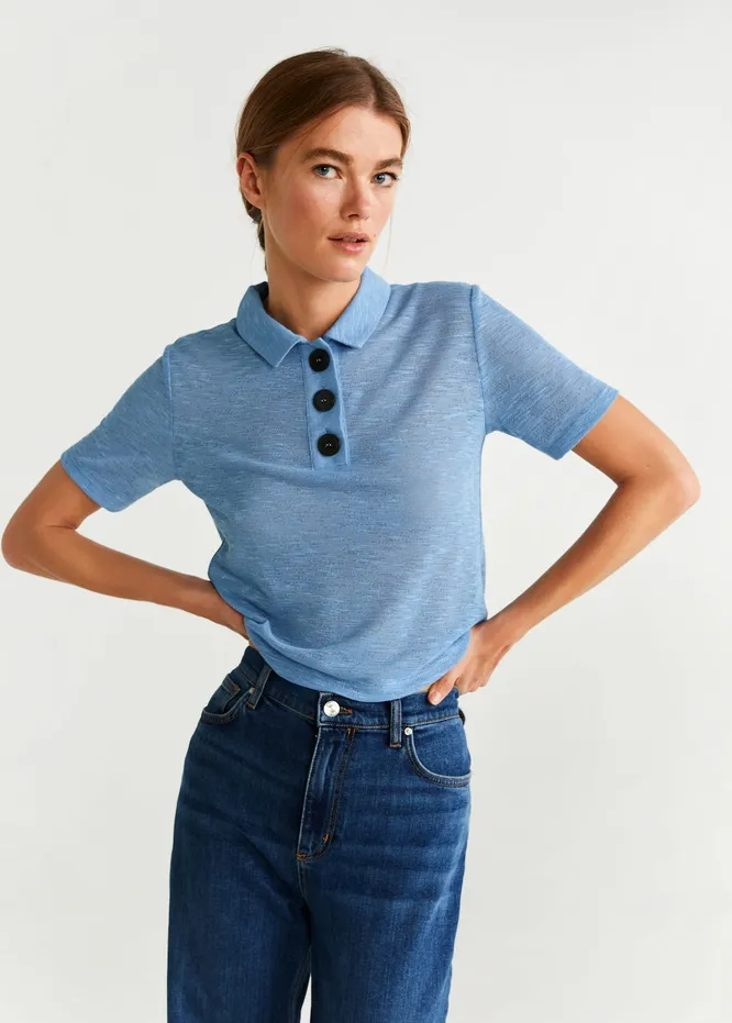 Легкое поло приятного небесно-голубого оттенка особенно эффектно смотрится в сочетании с денимом: это могут быть как классические синие джинсы, так и модные в этом сезоне джинсовые юбки миди. Роль акцента в этой модели играют крупные черные пуговицы, которые на контрасте придают ей расслабленный вид.