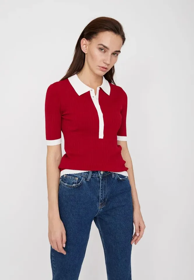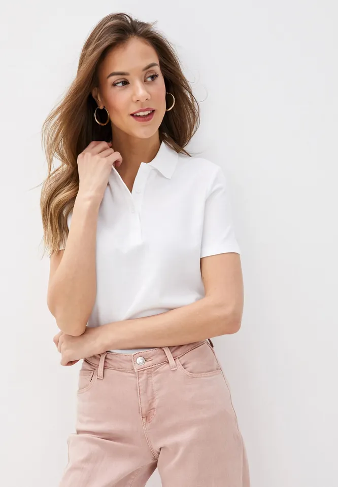 Облегающее поло в рубчик с контрастным белым воротничком и манжетами послужит яркой деталью в твоем повседневном образе. Его можно носить с джинсами, светлыми брюками или юбками, а также сочетать со спортивной одеждой. Отличный вариант на весну.
