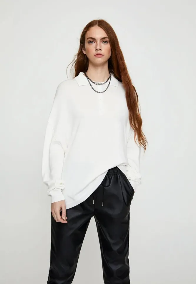 Поклонницам оверсайза мы советуем обратить внимание на это лаконичное поло. Особенно круто оно смотрится на контрасте с кожаными брюками и ботинками на толстой подошве — образ девочки-бунтарки тебе обеспечен.