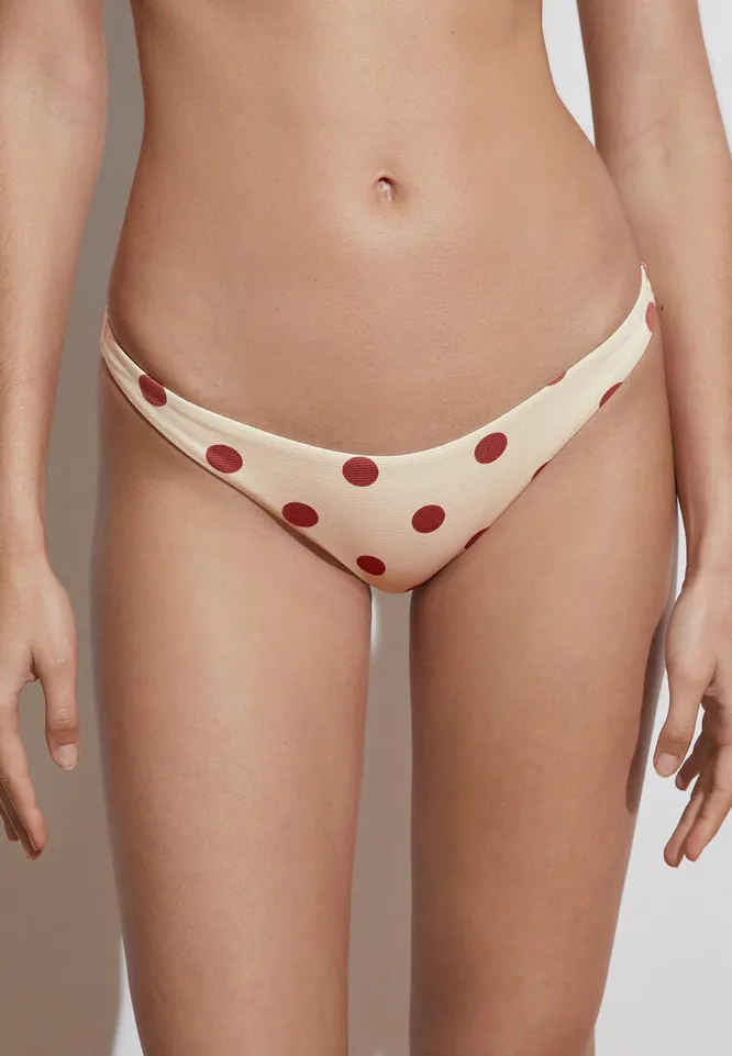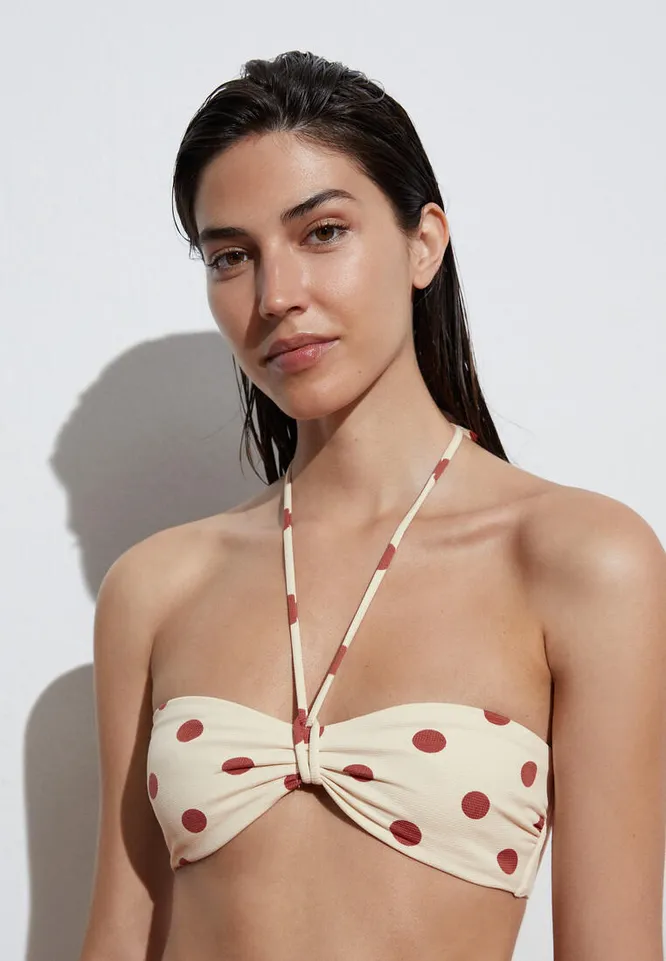 Еще одна бессмертная классика — горох. Удобный и модный топ-бандо на завязке, лаконичные плавки — ничего лишнего. Поверх можно накинуть легкую белую рубашку изо льна и дополнить ее пестрой пляжной юбкой.