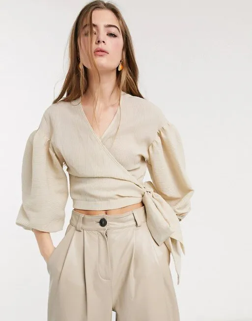 Лаконичная блуза из светлого фактурного материала найдет общий язык и с повседневными джинсами, и с юбкой на вечер. Запах подчеркивает талию, делая ее визуально тоньше, а пышные рукава придают образу легкость и нежность.