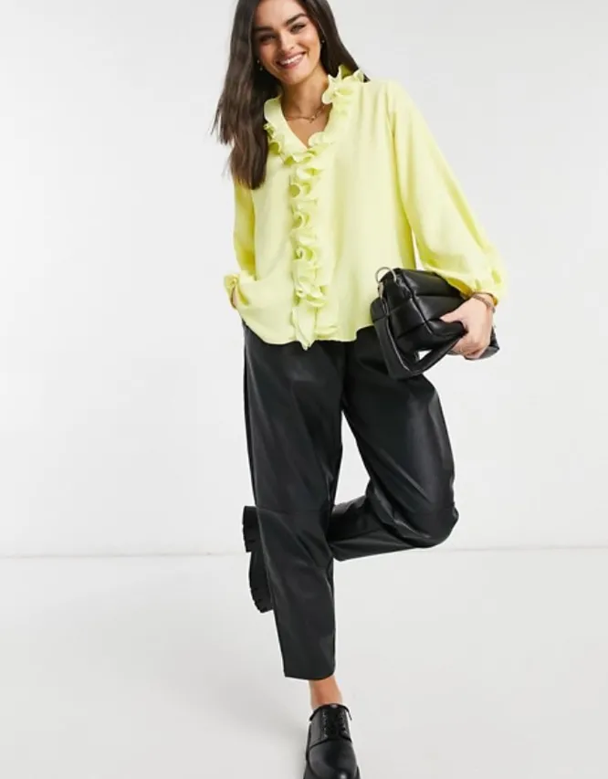 Романтичная желтая блуза с рюшами дополнит черные кожаные брюки или лакированную мини-юбку. В таком наряде можно пойти на вечеринку, если добавить пару акцентных украшений, или на неформальную встречу.
