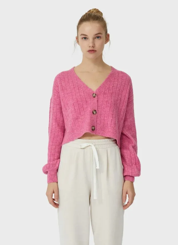 Укороченный кардиган цвета жвачки предлагаем носить поверх базовых водолазок и футболок с джинсами, брюками и юбками на высокой посадке. Летом надевай его на голое тело с шортами и текстильными кедами.