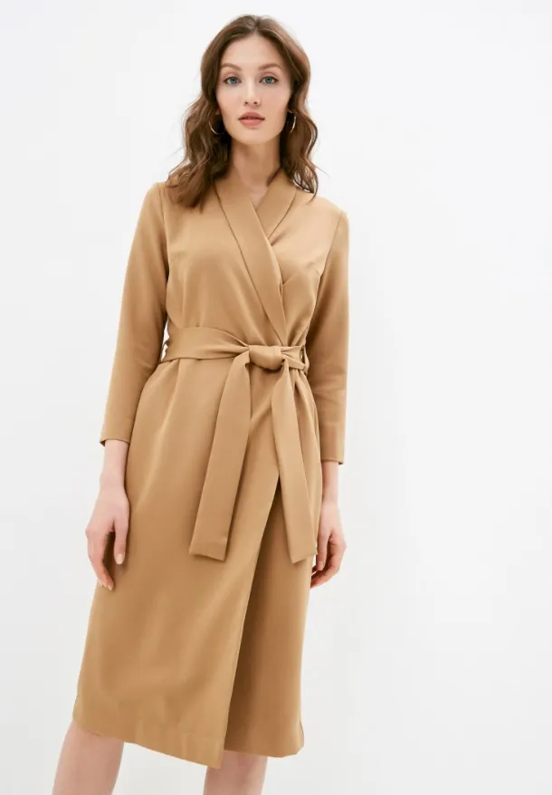 Идеальное платье на каждый день – модель с запахом песочного цвета. Его можно по-разному стилизовать при помощи обуви и аксессуаров в зависимости от того, куда ты собираешься пойти.