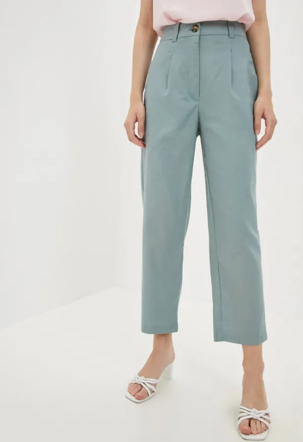 Для деловых образов предлагаем брюки приглушенного ментолового цвета. Подбери к ним жакет в тон, лаконичные кожаные лоферы и строгую белую рубашку.