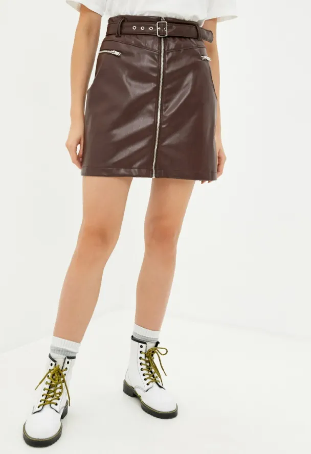 Кожаная коричневая юбка – универсальная базовая вещь. Ты можешь носить ее с водолазкой и удлиненным блейзером или сочетать с атласным топом и ботфортами, если собираешься на вечеринку.