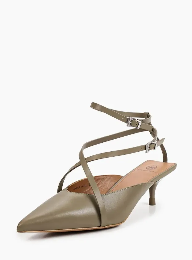 Остроносые туфли с переплетающимися ремешками станут отличным дополнением к повседневным лукам. Цвет хаки органично сочетается как с базовыми оттенками, так и с более яркими цветами.