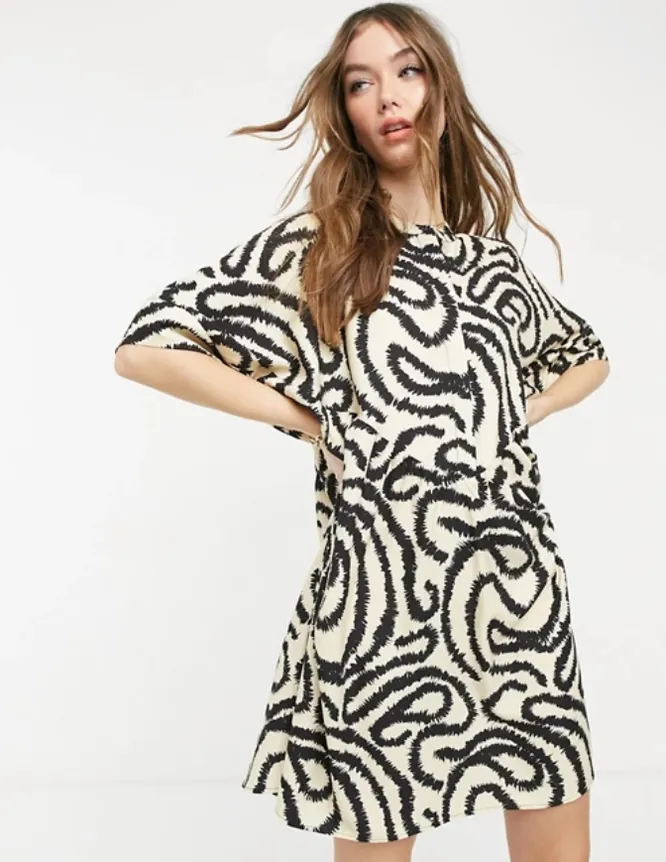 Платье-туника с графическим принтом органично сочетается с однотонным низом и минималистичными аксессуарами. Можно дополнить ее широким кожаным ремнем.