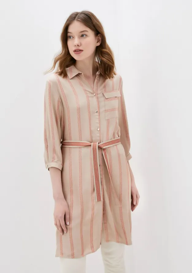 Универсальный вариант на каждый день — туника рубашечного кроя в вертикальную полосу. Советуем надевать ее с прямыми джинсами или брюками и кожаными лоферами.