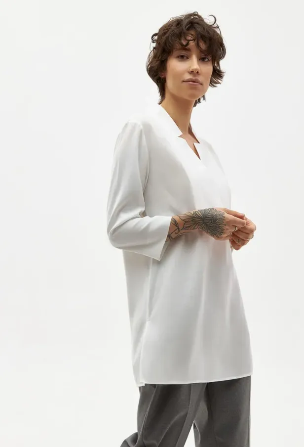 Элегантная туника из натурального шелка — удачное вложение в гардероб. Ее можно комбинировать и с кожаными брюками, и с джинсами, и с классическими «дудочками», и с шортами.