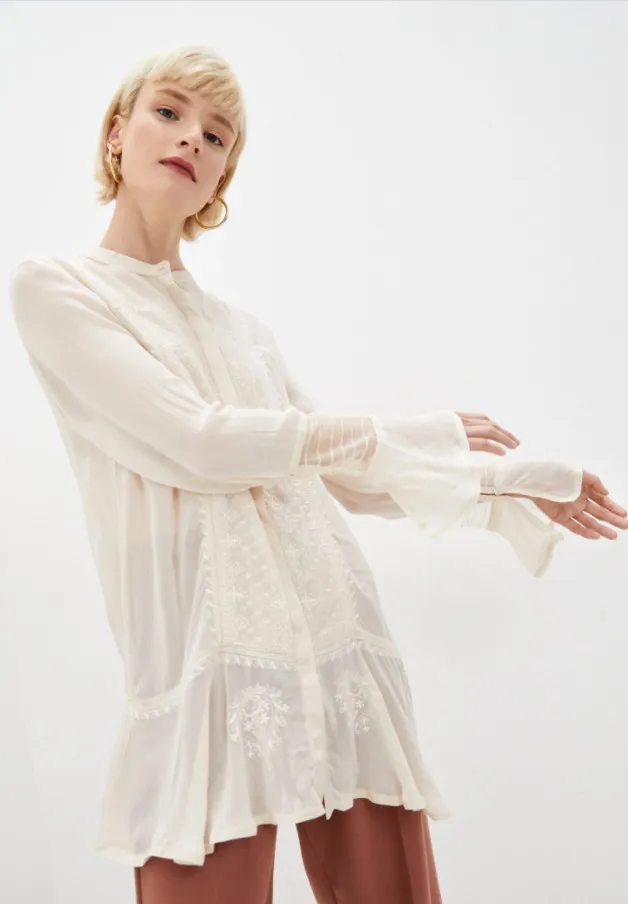 Для романтичных весенне-летних образов выбирай полупрозрачную тунику с вышивкой в стиле бохо. Дополняй ее замшевой юбкой, кожаными брюками или пестрыми широкими штанами с этническим узором.