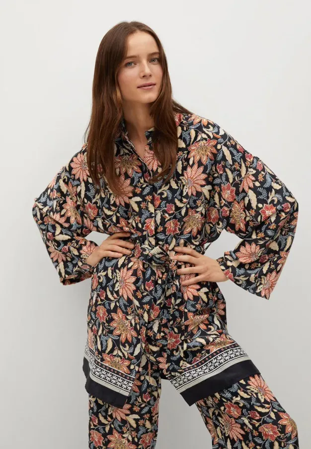 Пестрое кимоно стильно смотрится с широкими брюками в тон или с однотонными бежевыми, коричневыми или бордовыми. Можно носить его на голое тело или использовать как легкое летнее пальто.