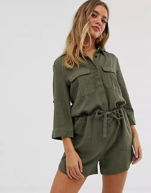 Возглавляет нашу подборку ромпер в стиле сафари. Он сшит изо льна цвета хаки и декорирован объемными карманами на груди и поясом на завязке. Лучше всего такая модель будет смотреться с легкими тканевыми кедами или сандалиями в спортивном стиле. Отличный наряд как для городской прогулки, так и для похода на природу с друзьями. Кстати, в таком комбинезоне у тебя получатся отличные фото на фоне гор и озёр.