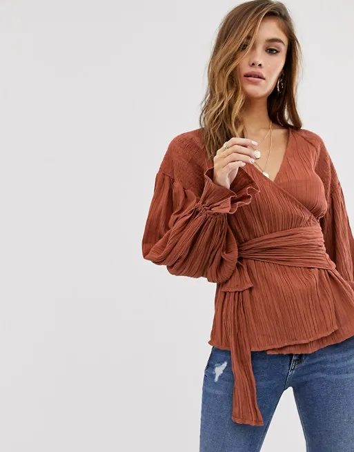 Волшебным свойством преображать фигуру обладают топы на запах. В таких моделях талия смотрится тоньше, плечи изящнее, а шея длиннее. Эффект достигается за счет V-образного декольте и пояса-завязки. Присмотрели для тебя модель универсального медного оттенка из воздушного фактурного материала — она будет гармонично сочетаться с синими джинсами, свободными светлыми брюками на весну, а также брюками классического кроя.