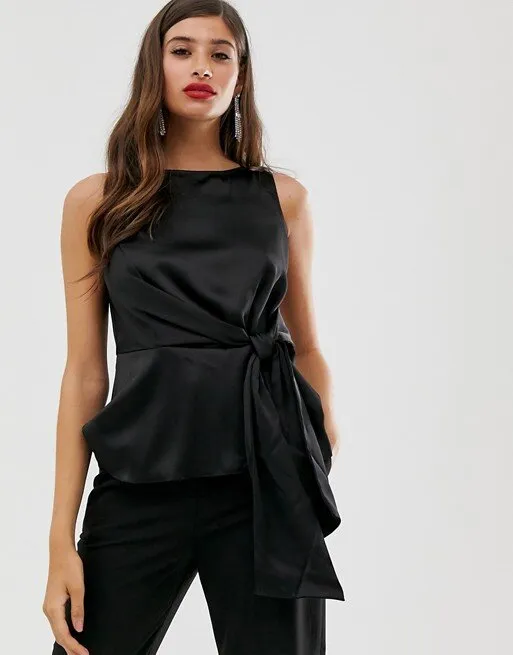 Элегантный черный топ с завязкой на поясе подойдет для классических образов в офис, театр или на выставку. В такой модели талия выглядит тоньше, а массивный бант сбоку вытянет силуэт. Дополняй наряд каблуками, чтобы казаться еще выше и стройнее.