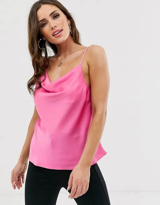 Ярко-розовый атласный топ в бельевом стиле станет ярким акцентом как в образе с джинсами, так и в наряде на вечер. Его можно носить навыпуск или заправить за пояс брюк с высокой посадкой, если хочется подчеркнуть талию. Свободный ворот добавляет объема в области груди, а разные по ширине бретели отвлекают внимание от плеч, тем самым делая их менее выраженными.