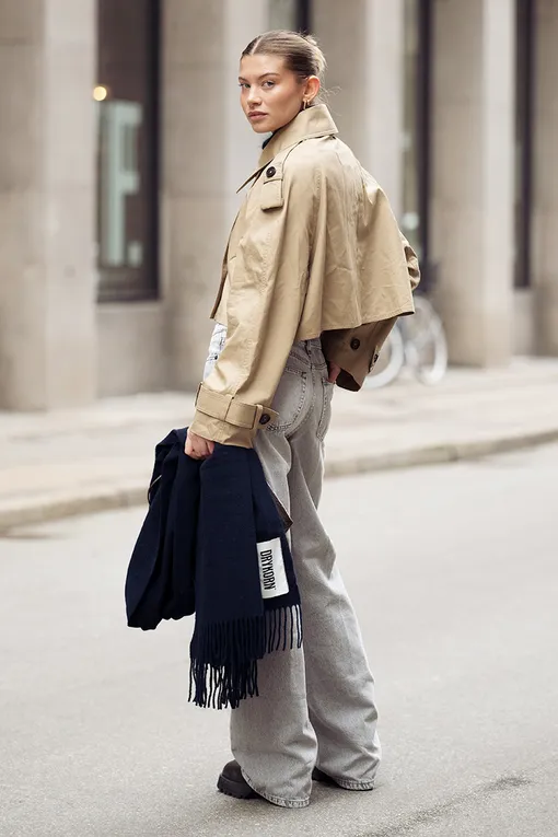 Расслабленный кроп-тренч – аналог оверсайз-жакета, который мы с тобой умеем сочетать с чем угодно. Ровно по такой же системе «работает» укороченный плащ: добавляй его в те же look'и, куда интегрировала свободный пиджак, и аутфит сам сложится.