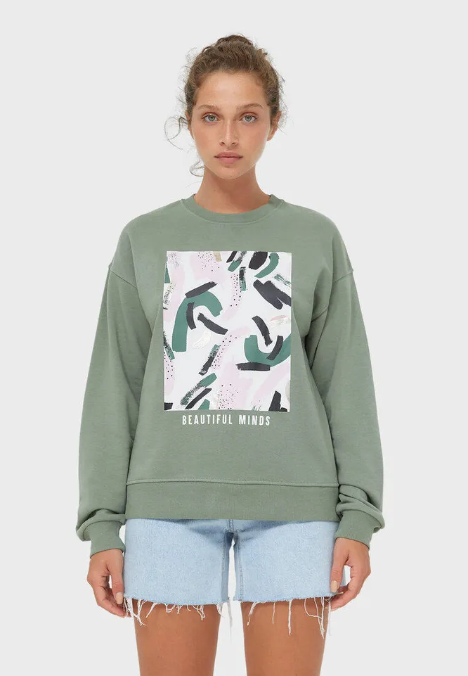 В новом сезоне делай ставку на модели в бежевых и кремовых тонах. Это могут быть как однотонные толстовки, так и варианты с красочными принтами. Например, такой свитшот можно надеть с голубыми джинсами и кожаными казаками – получится модный повседневный лук.