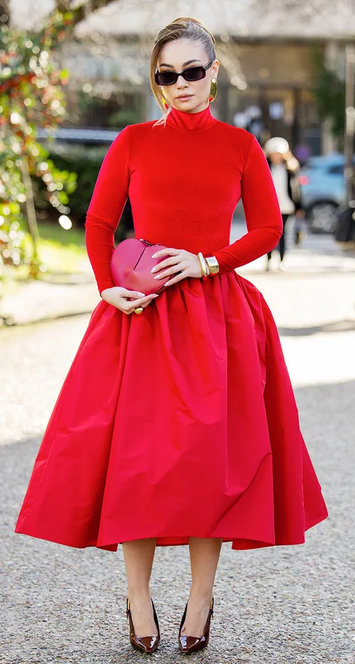 Тут все очевидно: встречать год Красной Огненной Лошади в красном и оранжевом – максимально логичная и проверенная идея. Причем котируются все оттенки: огненный алый, глубокий бургунди, кармин, вишневый, и даже сложный коралловый.