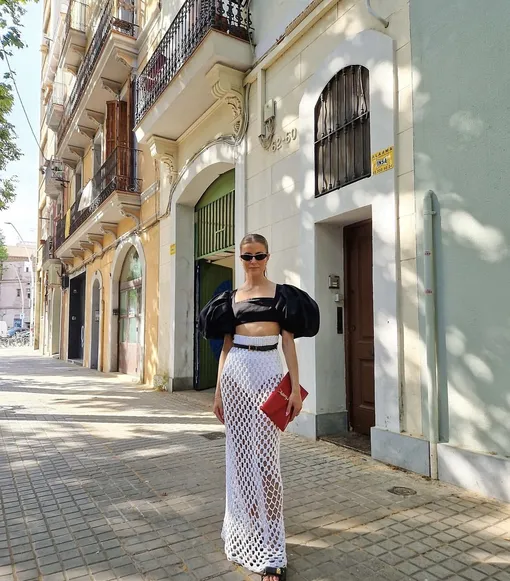 Выходя в свет, носим юбку с коротким топом с объемными рукавами — пляжный look сразу же превращается в городской. Не забываем золотое правило лета: чем длиннее юбка, тем короче верх, и наоборот. Добавим акцентную яркую сумку и массивные босоножки. Талию подчеркнем поясом или средним по ширине ремнем.
