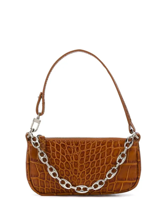 Модель в в стиле 90-х с эффектом крокодиловой кожи декорирована массивной цепью. Короткий ремешок позволяет носить ее как в руке, так и на плече, что, кстати, очень удобно. Нам она нравится за то, что способна даже в самый простой будничный образ добавить изюминку: попробуй примерить ее с джинсами и белой футболкой — разницу с ней и без нее ты ощутишь сразу.