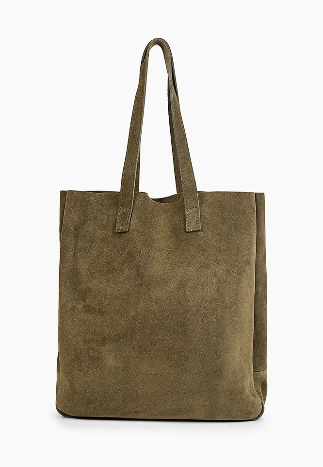Тем, кто отдает предпочтение шоперам, советуем обратить внимание на замшевую сумку модного цвета хаки.