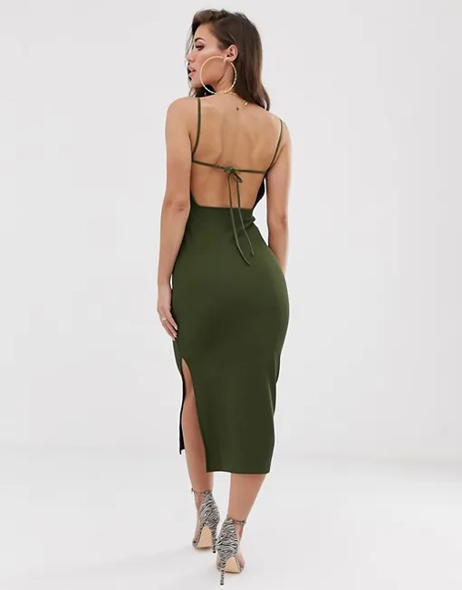 Облегающее платье цвета хаки ты сможешь носить как каждый день с белыми кроссовками и объемной джинсовкой бойфренда, так и по особым случаям — достаточно добавить босоножки с застежкой на щиколотке, серьги-кольца и клатч прямоугольной формы.