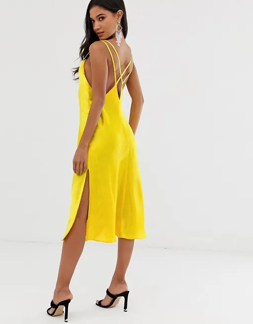 Отправляясь на свидание жарким летним деньком, надевай атласное платье цвета спелого лимона. Модель свободного кроя на тонких двойных бретелях, скрещенных на спине, отлично сядет на любую фигуру. Высокий разрез сбоку добавит образу немного кокетства. Дополняй образ серьгами-подвесками и «невидимыми» босоножками с завязками.