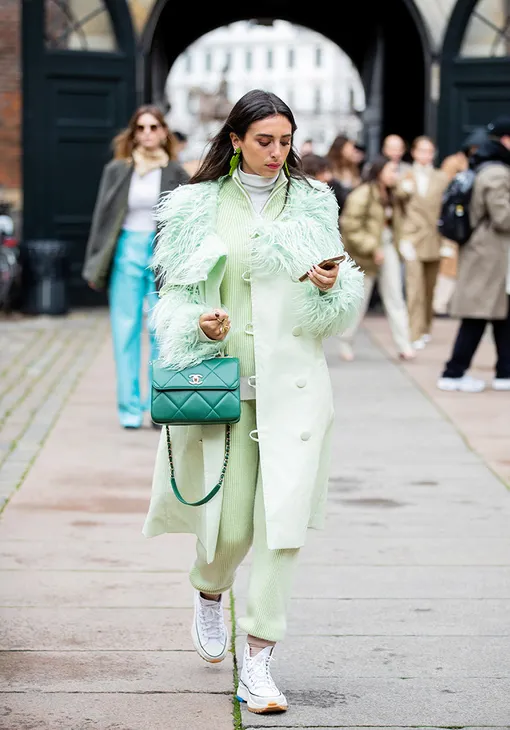 Многие боятся высоких кроссовок и думают, что они утяжеляют образ. А вот и зря. Модную обувь можно комбинировать с монохромными комплектами. А в особенности с яркими монолуками под цвет кроссовок. Не веришь? Посмотри, как удачно смотрятся желтые кроссы с желтым классическим брючным костюмом и горчичной сумкой. По примеру звезды стритстайла, надень под блейзер полупрозрачную блузку.