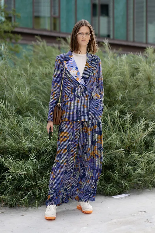 Не любишь черно-белые осенние комплекты? Вдохновляйся образом стритстайл-героини. Мы предлагаем тебе, как гостья модной съемки, носить массивные кроссовки с широкими спортивными брюками, воздушной блузой в цветочек и серым мини-пуховиком. В качестве дополнения используй золотистую цепочку на шею.