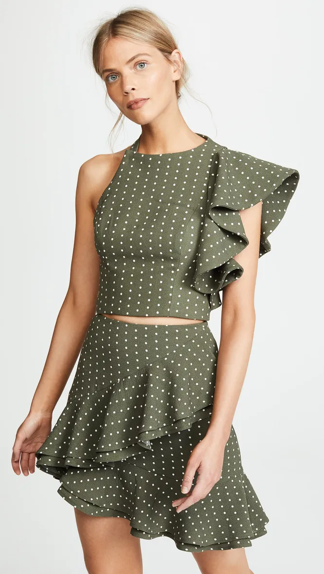 Топ и юбка с воланами придутся кстати на летних музыкальных фестивалях — эту «парочку» отлично дополнят белые кеды.