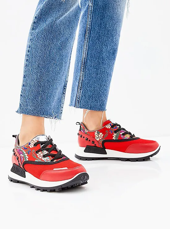 Самым смелым модницам непременно придутся по душе ярко-красные кроссовки с принтом и черным кантом — идеальное дополнение и к casual-образу, и к коктейльному (просто надень их с мини-платьем или короткой кожаной юбкой).