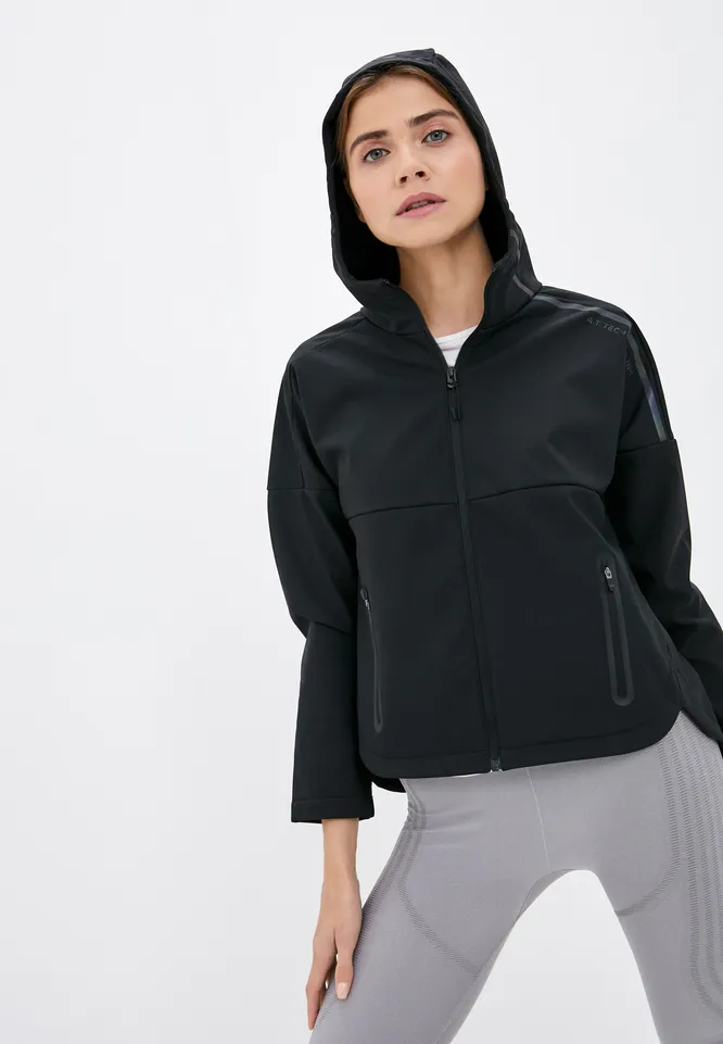 Еще один вариант – черная ветровка из мягкого материала с отстегивающимся капюшоном. Практичная, стильная, универсальная – идеальный вариант для ежедневных занятий! Подойдет как для пробежек, так и для силовых тренировок.