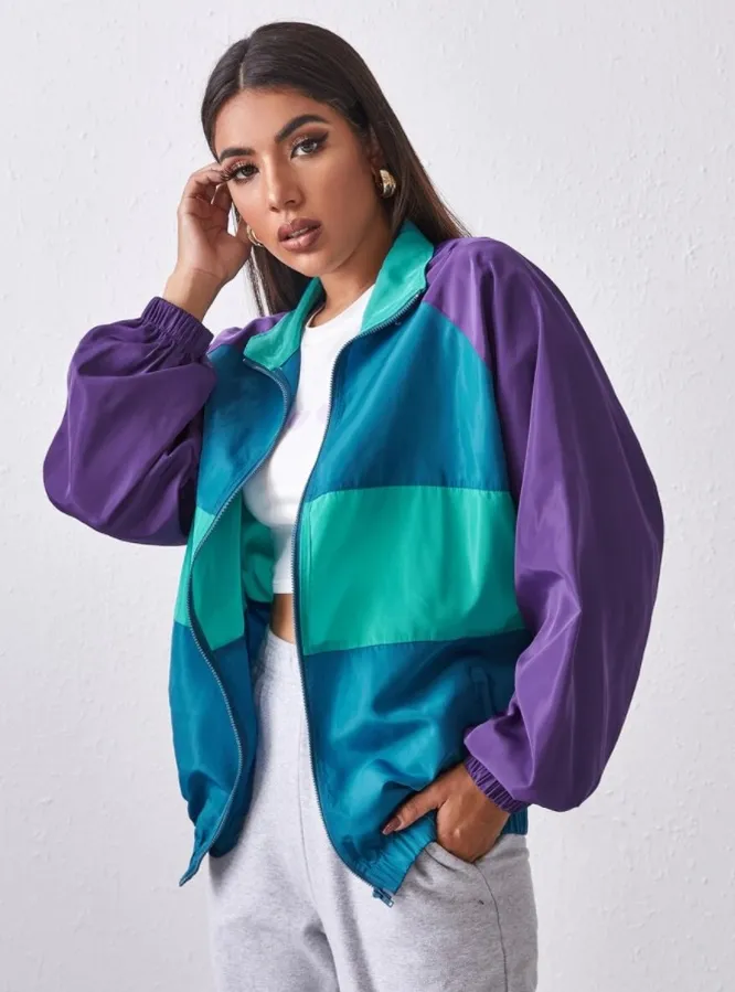 Для образов в спортивном стиле выбирай оверсайз-ветровку с яркими цветными вставками. В пару к ней выбирай леггинсы или спортивные штаны, пару массивных кроссовок и бейсболку. Под куртку надевай объемную толстовку или свитшот, свободную рубашку или футболку – получится стильный многослойных лук.