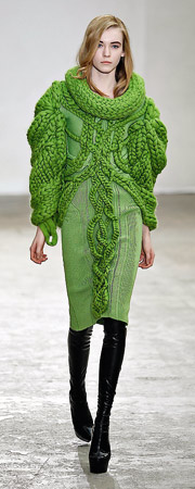 Трикотаж крупной вязки возвращается. Связанные на гигантских спицах косы повсюду: на платьях, пальто, шарфах.