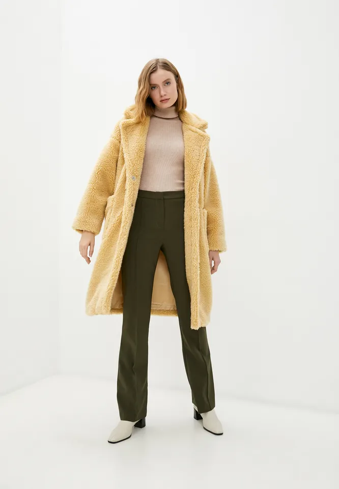 Меховое пальто с карманами приглушенного желтого цвета – подходящий вариант для тех, кто хочет освежить зимние образы. Пальто хорошо миксуется с разными вещами. Если собираешься за город, надевай его с трикотажным костюмом и зимними кроссовками или ботинками на тракторной подошве. Чтобы создать деловой лук, комбинируй пальто с базовой водолазкой в рубчик и широкими брюками на высокой посадке. В будни носи его с любыми моделями джинсов и уютными свитерами крупной вязки.