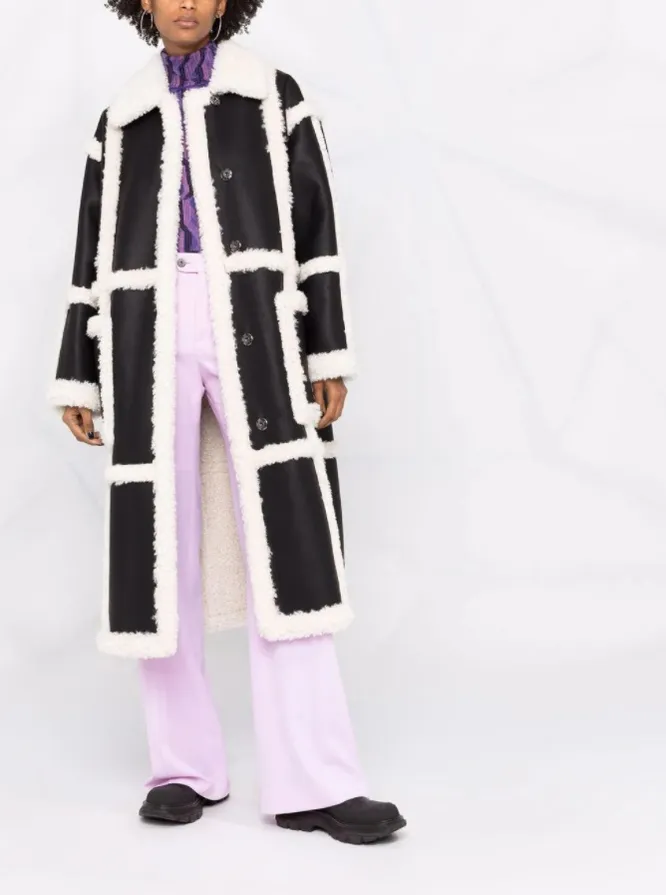 Монохромный черно-белый образ – беспроигрышный вариант, куда бы ты ни собиралась. В качестве верхней одежды выбирай черное меховое пальто или вариант с контрастными белыми вставками. Оно не только станет стильным завершением ансамбля, но и добавит ему фактурности и динамичности. Расставить акценты поможет кожаная сумка на цепочке и массивная пара обуви (например, грубые ботинки челси).
