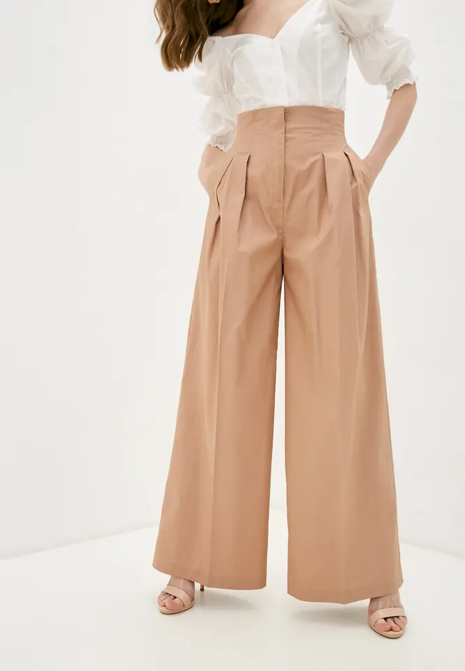 Светло-бежевые брюки из вискозы сочетай с яркой блузой или топом и обувью на каблуке. Это могут быть модные в этом сезоне вьетнамки на каблуке или мюли.