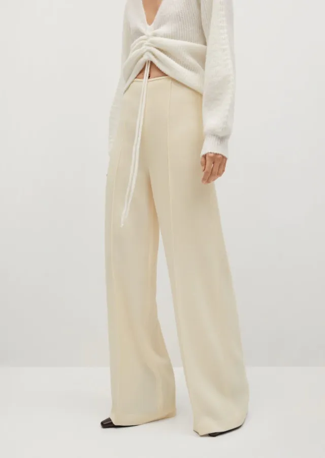Кремовые брюки со стрелками – отличная основа повседневного образа. Можно носить их и со строгой рубашкой, и с пестрой футболкой, и с романтичной блузой.