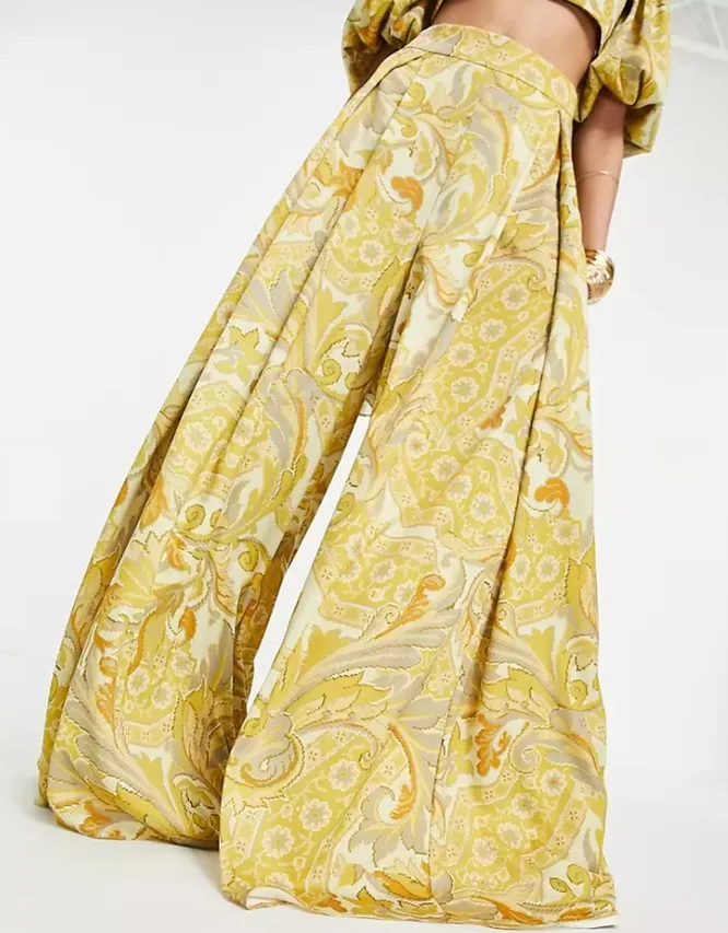 Создать эффектный лук помогут брюки палаццо в пол с пестрым принтом. Высокая посадка и защипы подчеркнут талию и визуально удлинят ноги, вытянут силуэт.