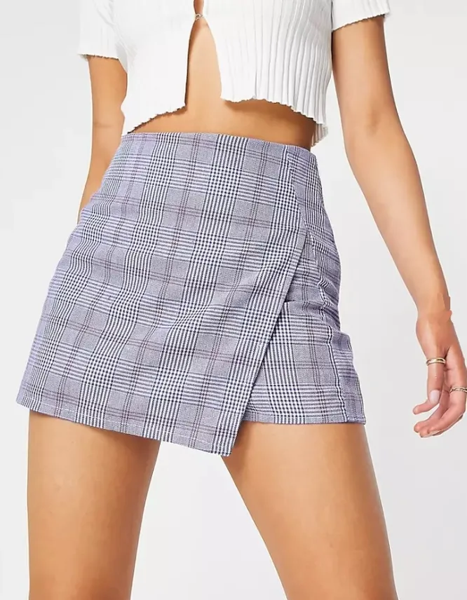 Клетчатая юбка-шорты с запахом легко впишется в офисные луки. Например, можно носить ее с блузкой без рукавов и легким льняным жакетом.