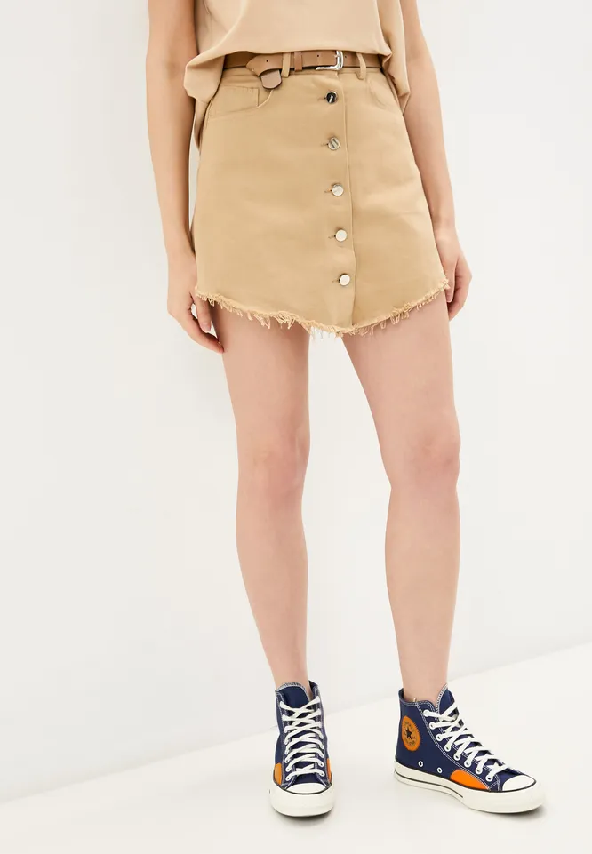 Универсальный вариант на каждый день — песочная юбка-шорты из денима. Модель стильно смотрится с топами в спортивном стиле и кедами.